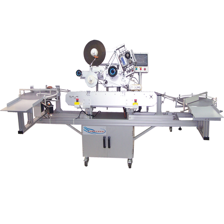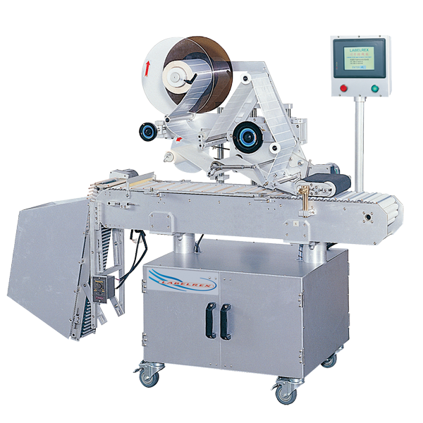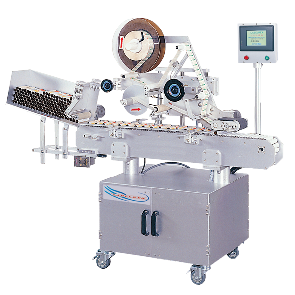 Specially used in labeling medical ampoules and contact lens bottles in conjunction with an automatic feeding and retrieving system.